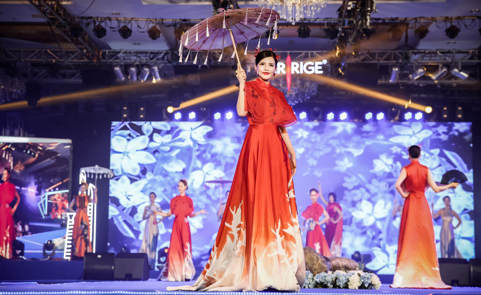 在国韵之美的旗袍大秀环节中,伴随着《女人花》悠扬的歌声,红蓝色调的中国风里,佳丽们的极致曲线与优雅的身形让人挪不开眼,古典旗袍美与塑身衣现代感相得益彰,优雅与典美,尽展古典东方女性神韵。